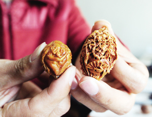 停下手中電動刻刀的晏捷說:“我本來就是學雕塑的,從藝術(shù)上講,核雕與其它雕塑有異曲同工之妙。然而核雕屬于微雕,需要雕刻者更加細心、耐心和用功,一根線條、一個塊點,稍有差池,作品就可能變成垃圾。”在核雕技藝選擇中,晏捷更喜好橄欖核雕,其中大部分作品雕的是佛像和歷史人物肖像。