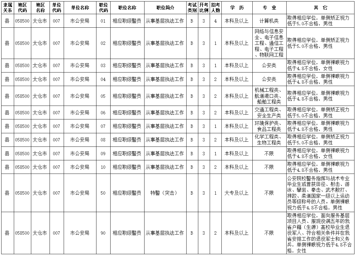 江蘇省2026年度考試錄用公務(wù)員公告發(fā)布,如果你有一個熱血的警察夢,想穿上警服書寫藏藍人生。太倉市公安局12個崗位、21個名額期待你的加入! 一、招錄職位信息 點擊圖片放大 三、報名時間 2025年11月4日9:00至11月10日16:00 四、繳費時間 2025年11月4日9:00至11月13日16:00 、筆試時間 公安專業(yè)科目筆試時間 2025年12月6日 下午 14:00-16:00 ...
